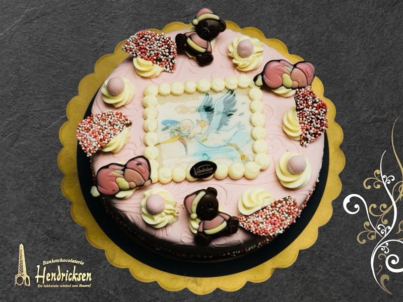 Onze geboortetaart is gemaakt van een romige slagroomvulling, met een kapselbasis gecombineerd met een laagje aardbeienjam. Afgewerkt met rolfondant en een feestelijke uitstraling.