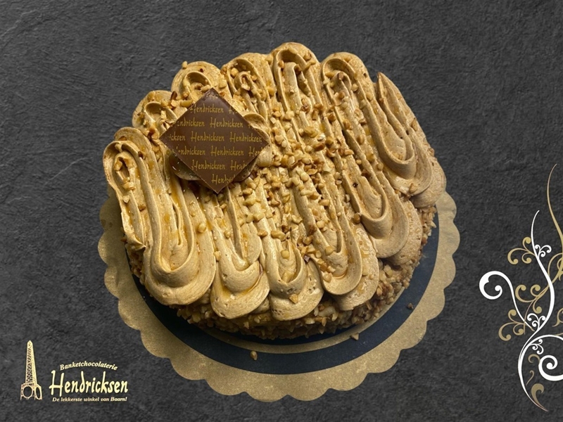 Dit heerlijke taartje bestaat uit een vers krokant gebakken hazelnootprogres met een vulling van romige zelfgekookte mokkacrème.